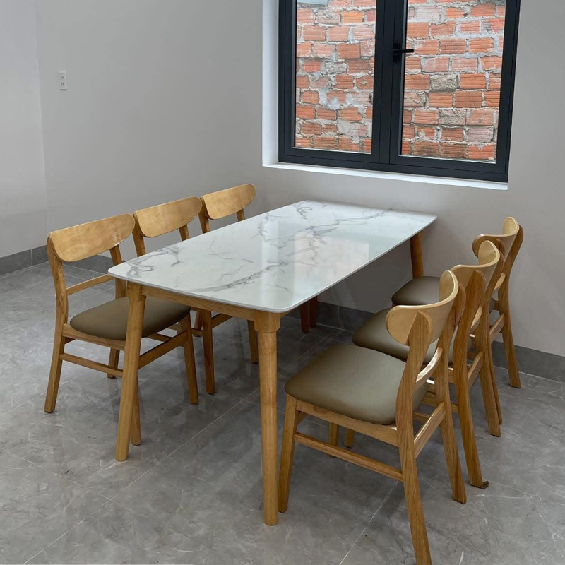 - Chất liệu: Gỗ cao su, mặt bàn MDF phủ melamine giả vân đá; nệm ghế bọc simili màu nâu ca cao (Khách có nhu cầu bọc màu nệm khác vui lòng liên hệ hotline)