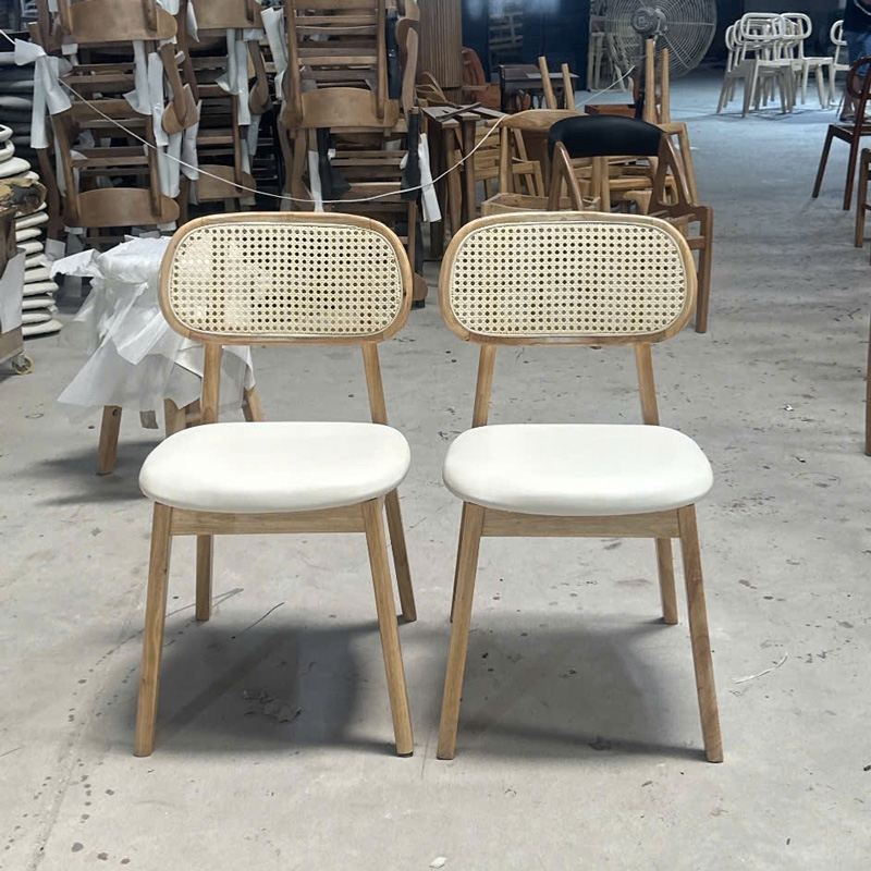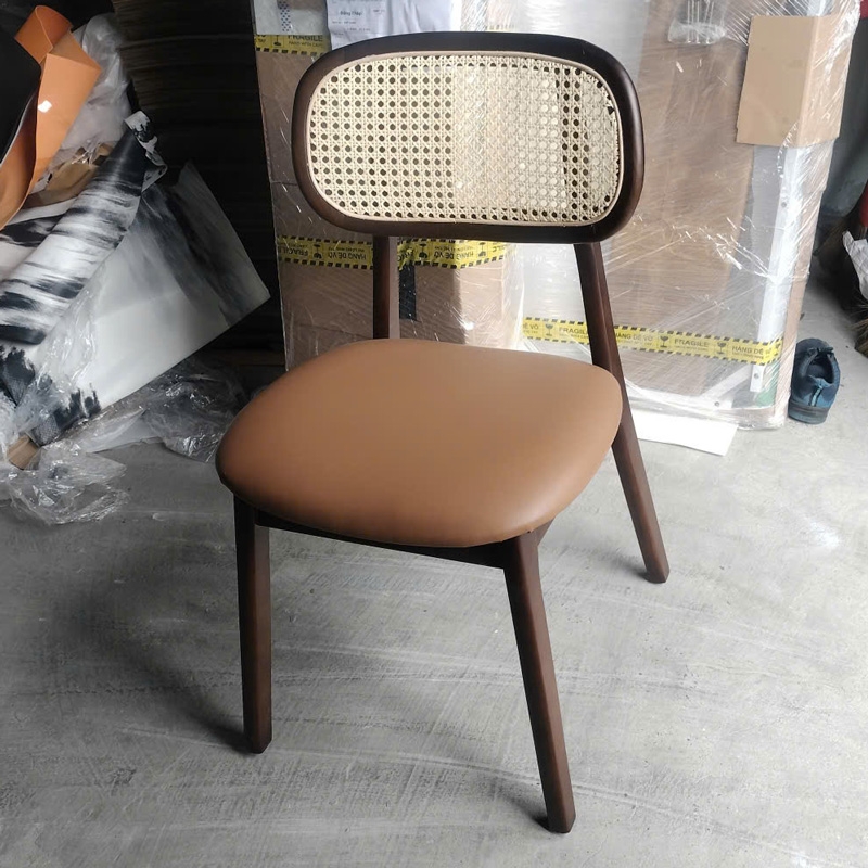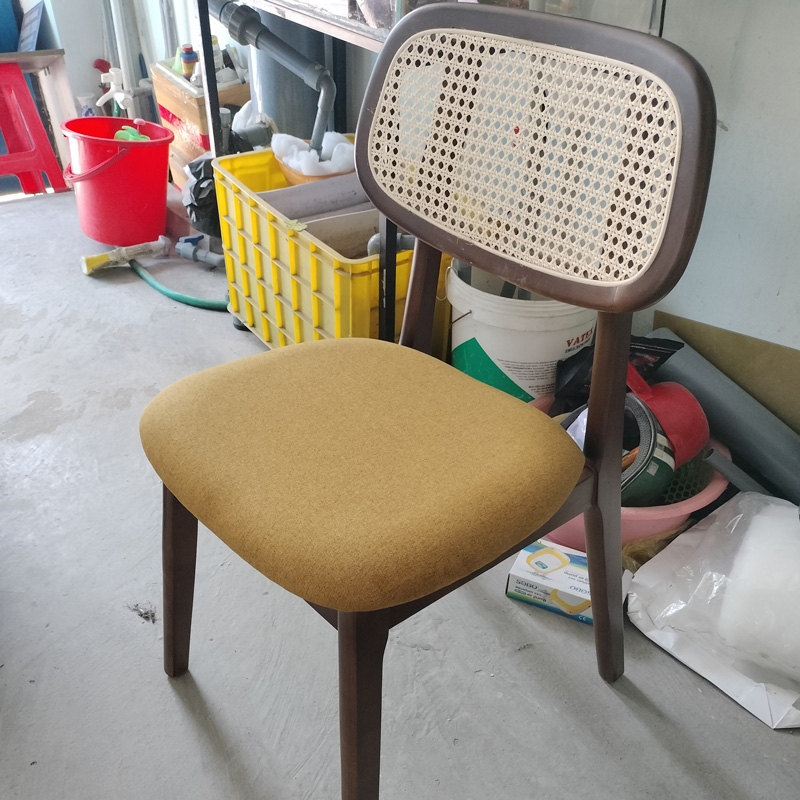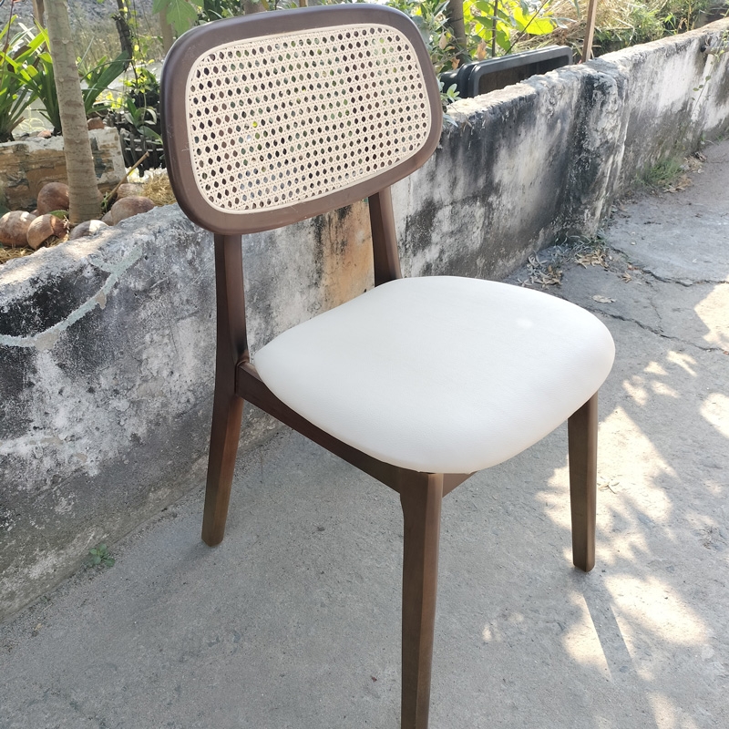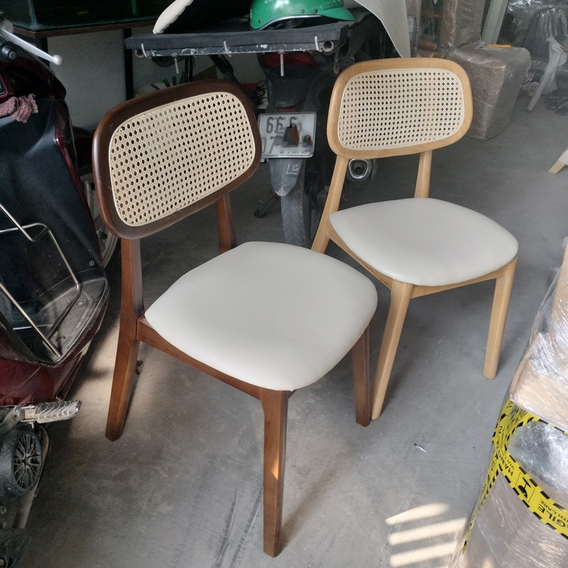 Ghế ăn PLC ấn tượng mạnh mẽ với thiết kế tựa lưng mây nhân tạo đan mắt cáo, mang đến cảm giác thoải mái cho người sử dụng. Khung ghế được làm từ gỗ cao su tự nhiên có khả năng chịu lực tốt, và vẻ đẹp tự nhiên ấm áp phù hợp cho nhiều loại không gian, từ phòng ăn, phòng khách đến không gian làm việc.