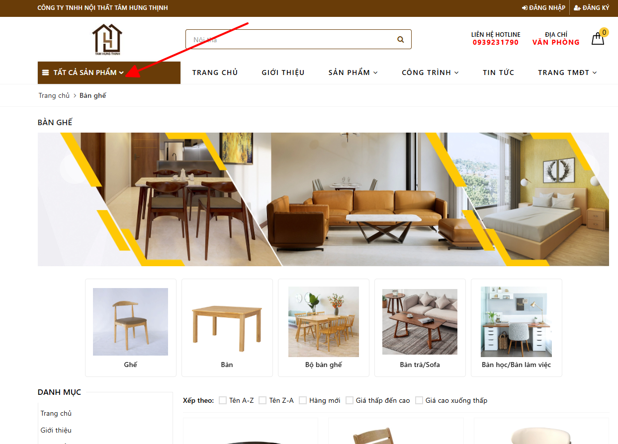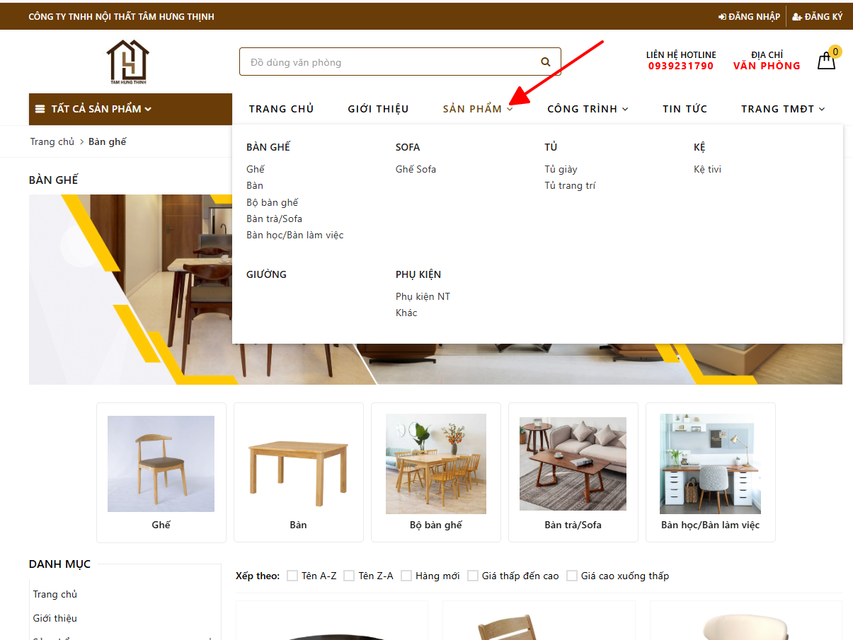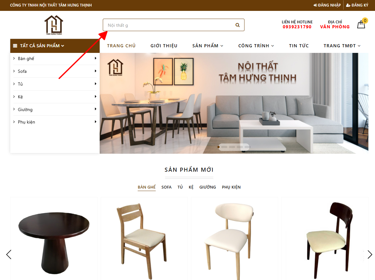 Sử dụng ô tìm kiếm phía trên, gõ tên sản phẩm muốn mua (bàn, ghế, tủ…..). Website sẽ cung cấp cho bạn những gợi ý chính xác để lựa chọn hoặc bạn có thể chọn vào danh mục sản phẩm